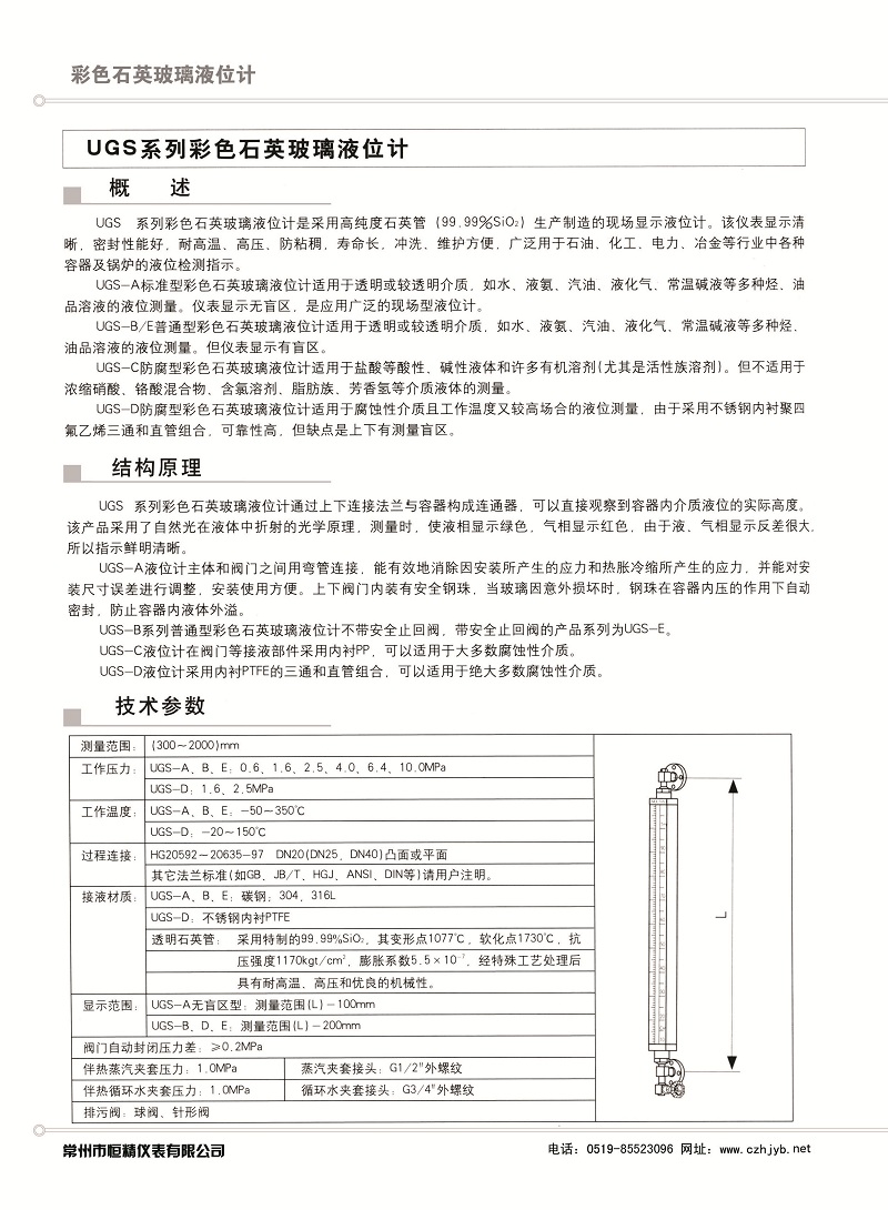 2、浮子三色石英管液位計(jì):特殊制造的小浮子在石英管里浮在的液-液界面上,同時(shí)還可以汽紅液綠指示液位。適用于低粘度介質(zhì),如液化氣-水、輕油-水及化工溶劑。液-液介質(zhì)比重差大于0.2g/cm。